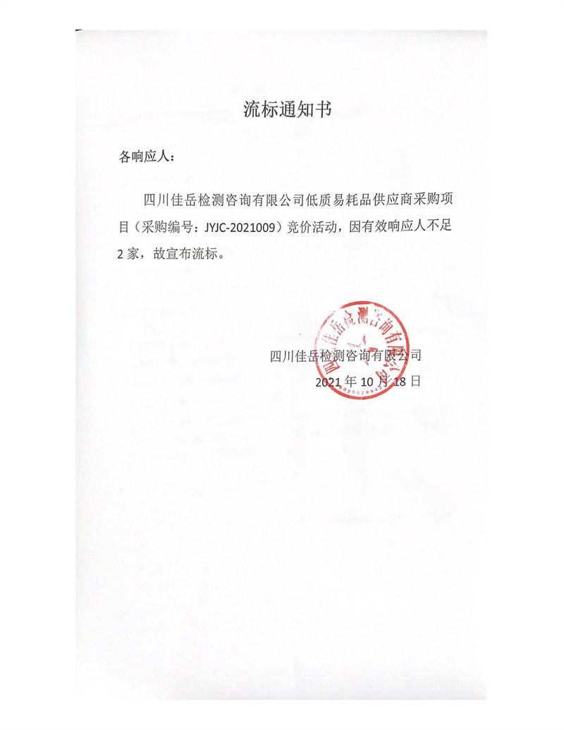 四川佳岳檢測咨詢有限公司低質(zhì)易耗品供應(yīng)商采購項(xiàng)目流標(biāo)通知