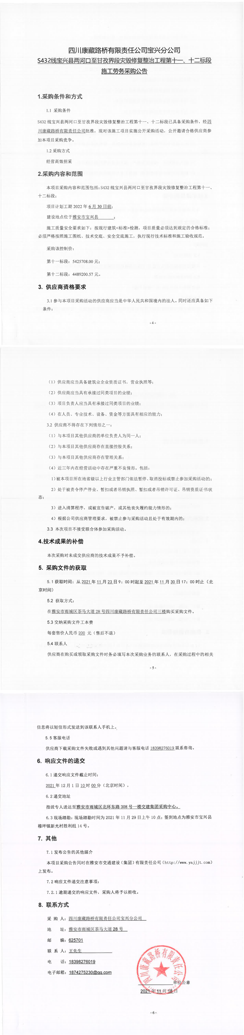 四川康藏路橋有限責(zé)任公司寶興分公司S432線(xiàn)寶興縣兩河口至甘孜界段災(zāi)毀修復(fù)整治工程第十一、十二標(biāo)段施工勞務(wù)采購(gòu)公告