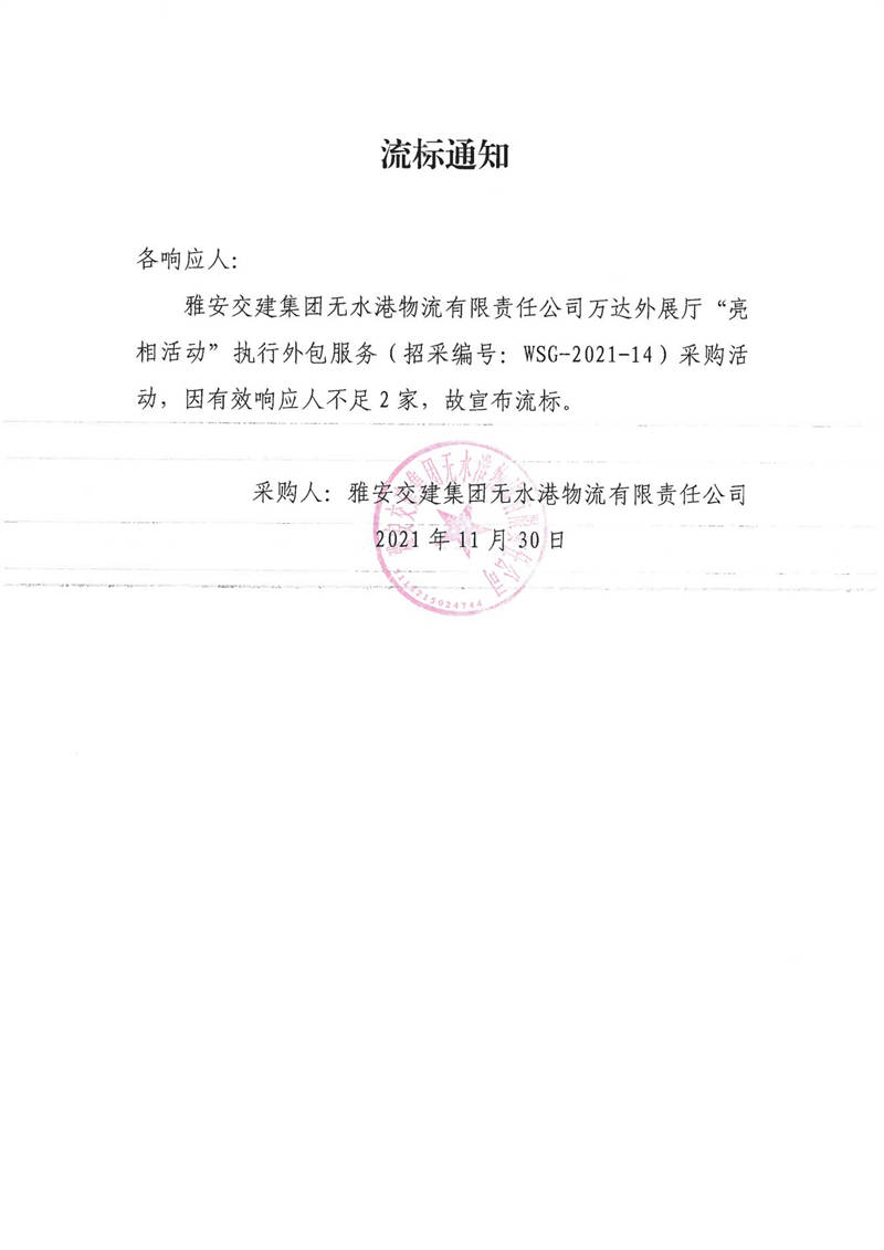 雅安交建集團(tuán)無水港物流有限責(zé)任公司萬達(dá)外展廳“亮相活動(dòng)”執(zhí)行外包服務(wù)流標(biāo)通知