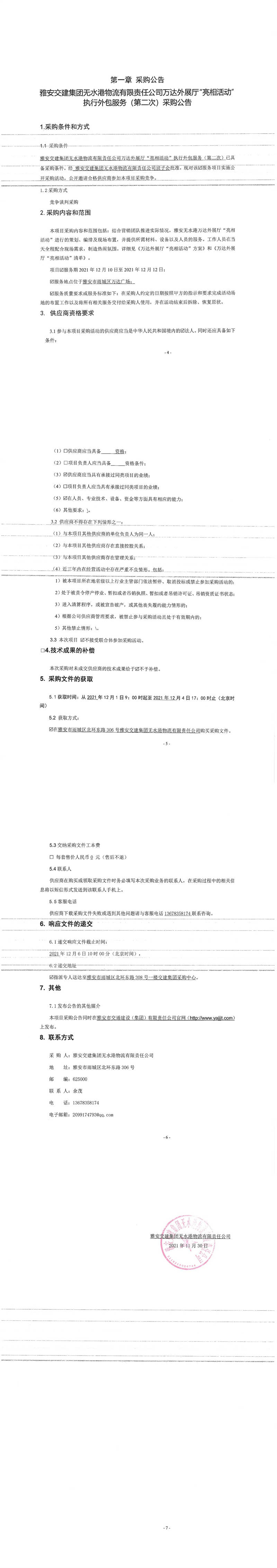 雅安交建集團無水港物流有限責(zé)任公司萬達(dá)外展廳“亮相活動”執(zhí)行外包服務(wù)(第二次)采購公告