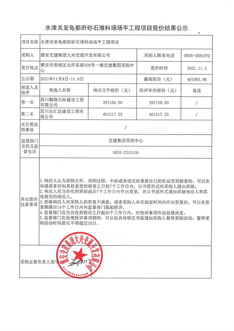 雅安交建集團(tuán)大興交通開發(fā)有限公司水津關(guān)至龜都府砂石堆料場場平工程項(xiàng)目競價(jià)結(jié)果公示