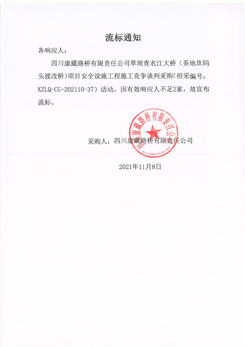 四川康藏路橋有限責任公司草壩青衣江大橋(茶地坎碼頭渡改橋)項目安全設施工程施工流標通知