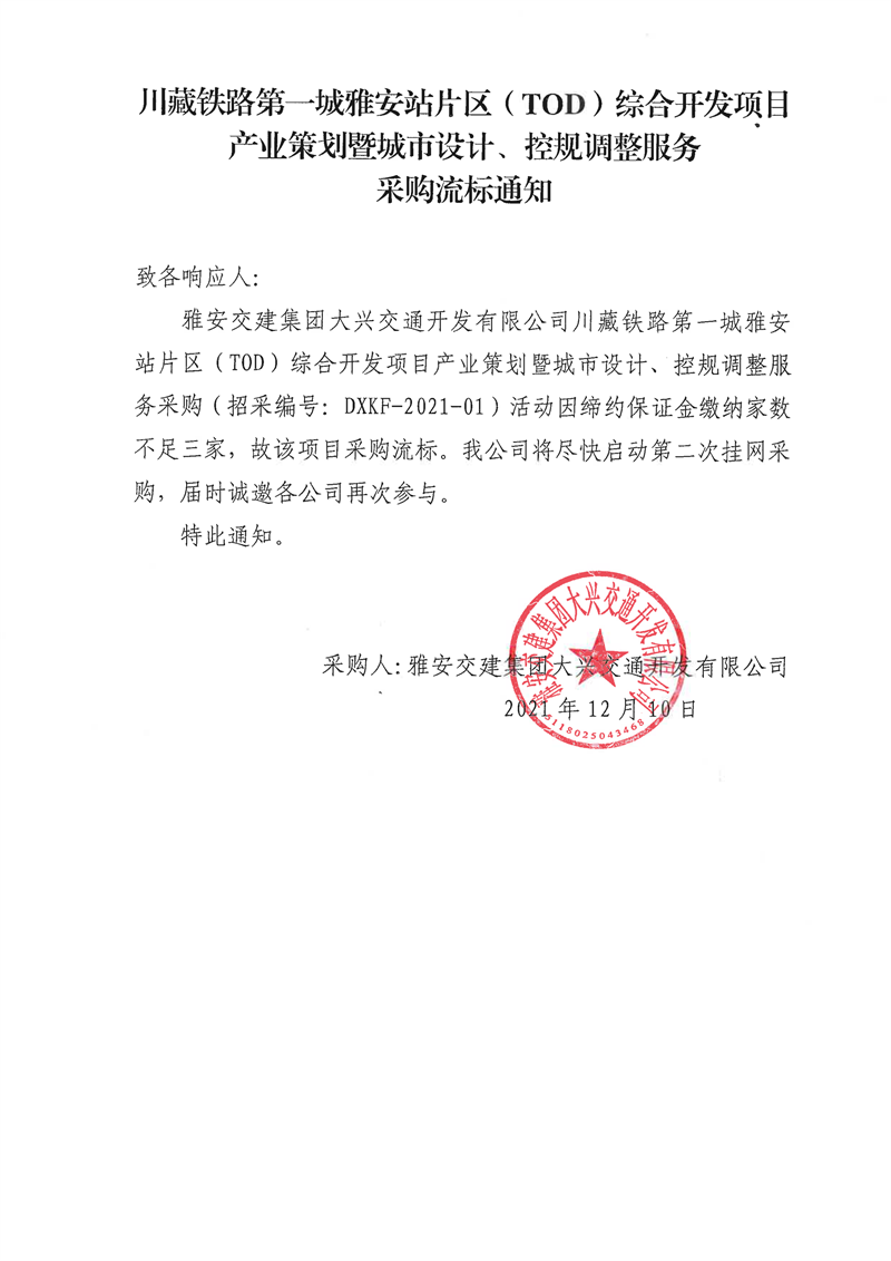雅安交建集團(tuán)大興交通開發(fā)有限公司川藏鐵路第一城雅安站片區(qū)(TOD)綜合開發(fā)項(xiàng)目產(chǎn)業(yè)策劃暨城市設(shè)計(jì)、控規(guī)調(diào)整服務(wù)采購流標(biāo)通知