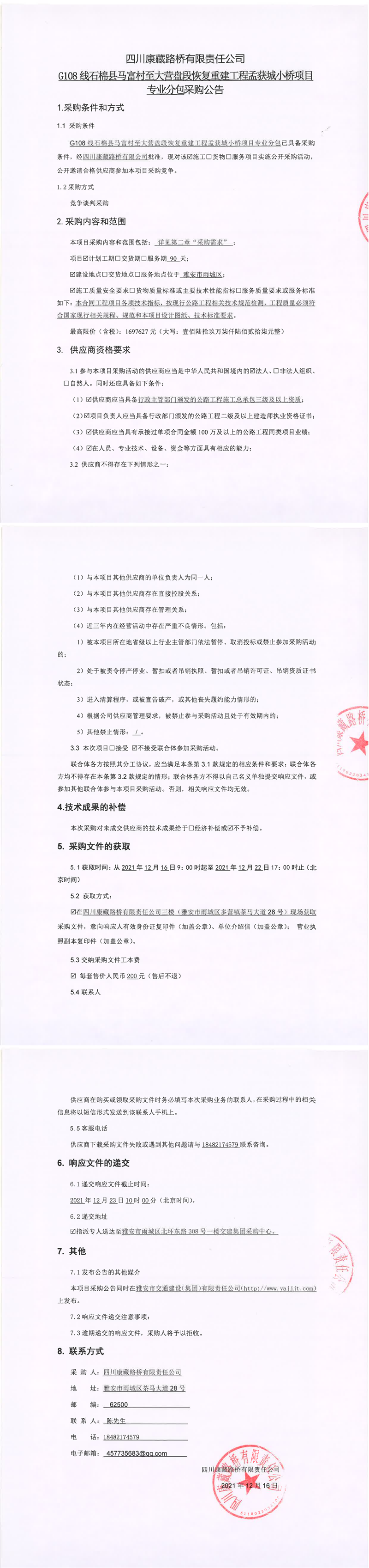 四川康藏路橋有限責任公司G108線石棉縣馬富村至大營盤段恢復重建工程孟獲城小橋項目專業(yè)分包采購公告