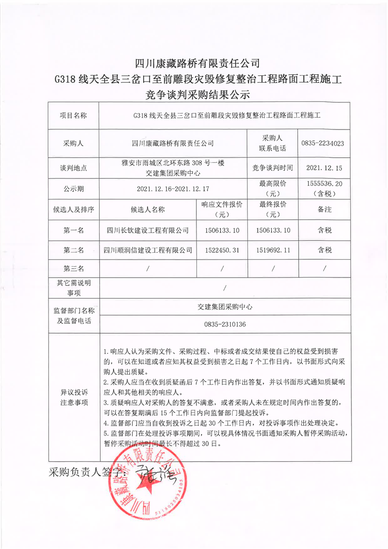 四川康藏路橋有限責(zé)任公司G318線天全縣三岔口至前碉段災(zāi)毀修復(fù)整治工程路面工程施工競爭談判采購結(jié)果公示