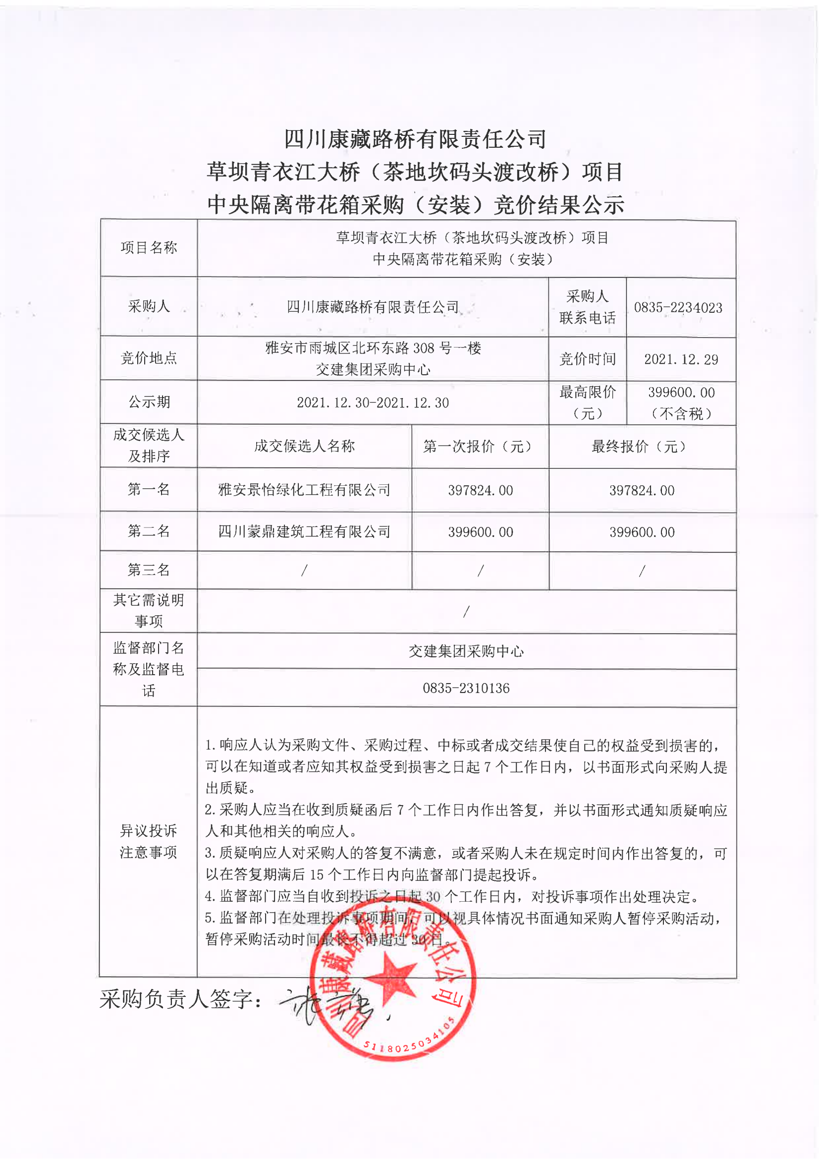 四川康藏路橋有限責(zé)任公司草壩青衣江大橋(茶地坎碼頭渡改橋)項(xiàng)目中央隔離帶花箱采購(安裝)競價(jià)結(jié)果公示