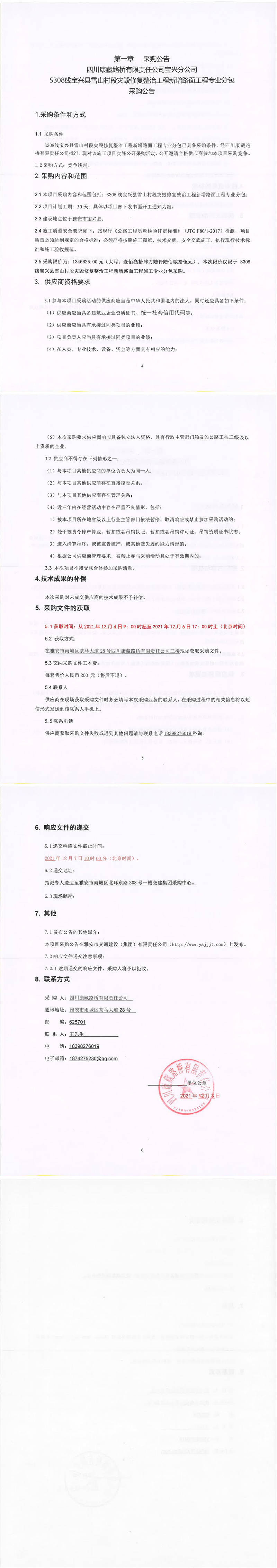 四川康藏路橋有限責(zé)任公司S308線寶興縣雪山村段災(zāi)毀修復(fù)整治工程新增路面工程施工專業(yè)分包采購(gòu)公告