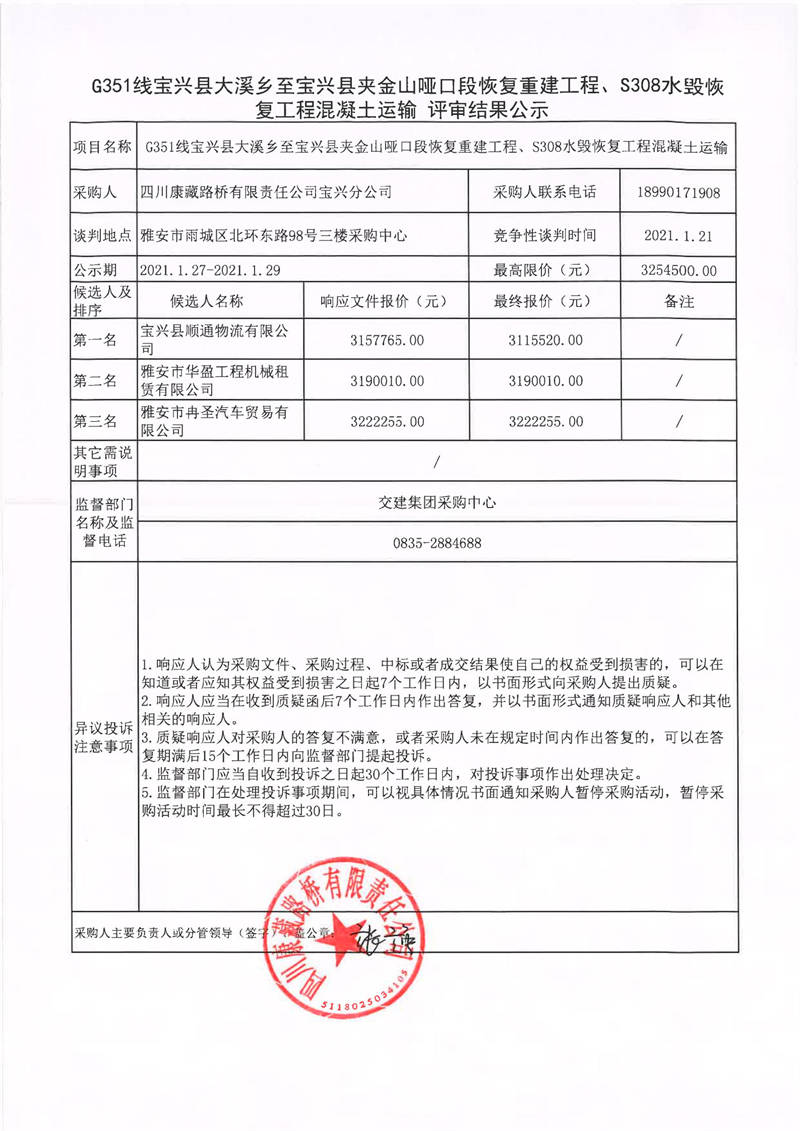 四川康藏路橋有限責(zé)任公司寶興分公司G351線寶興縣大溪鄉(xiāng)至寶興縣夾金山啞口段恢復(fù)重建工程、S308水毀恢復(fù)工程混凝土運(yùn)輸評(píng)審結(jié)果公示