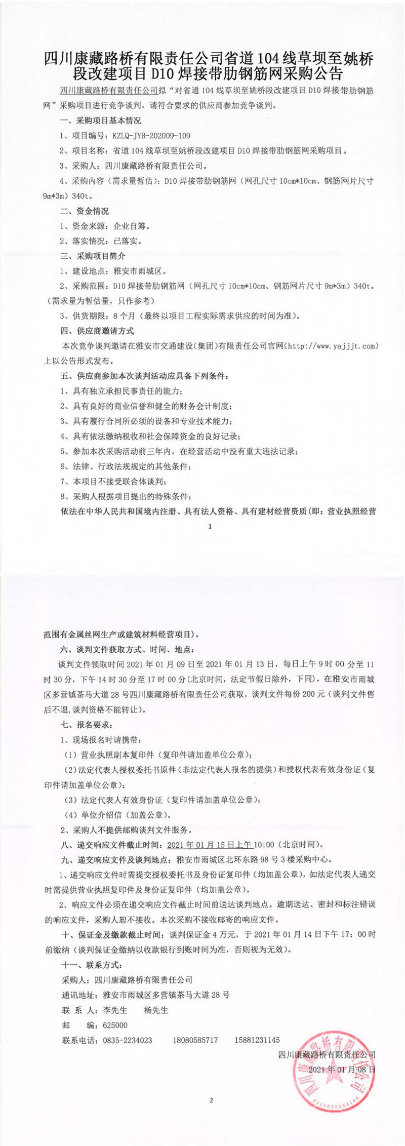 四川康藏路橋有限責任公司省道104線草壩至姚橋段改建項目D10焊接帶肋鋼筋網(wǎng)采購公告