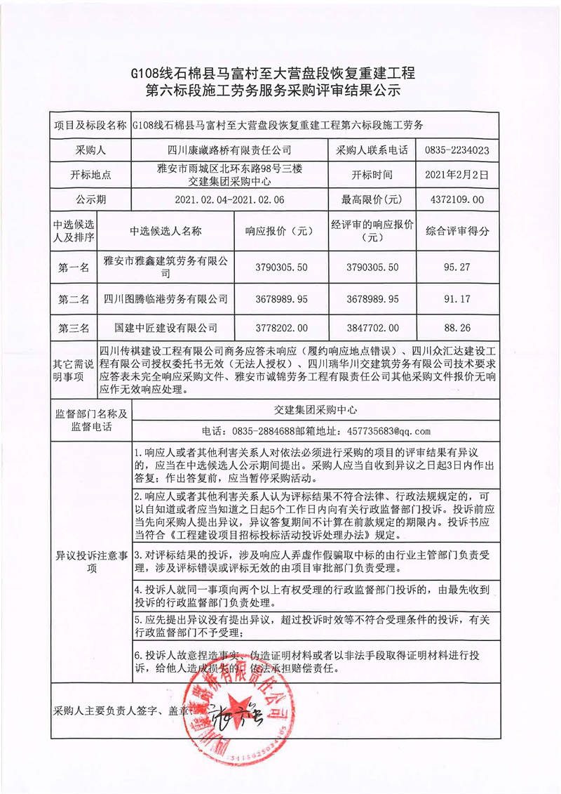 四川康藏路橋有限責(zé)任公司G108線石棉縣馬富村至大營(yíng)盤段恢復(fù)重建工程第六標(biāo)段施工勞務(wù)服務(wù)采購(gòu)評(píng)審結(jié)果公示
