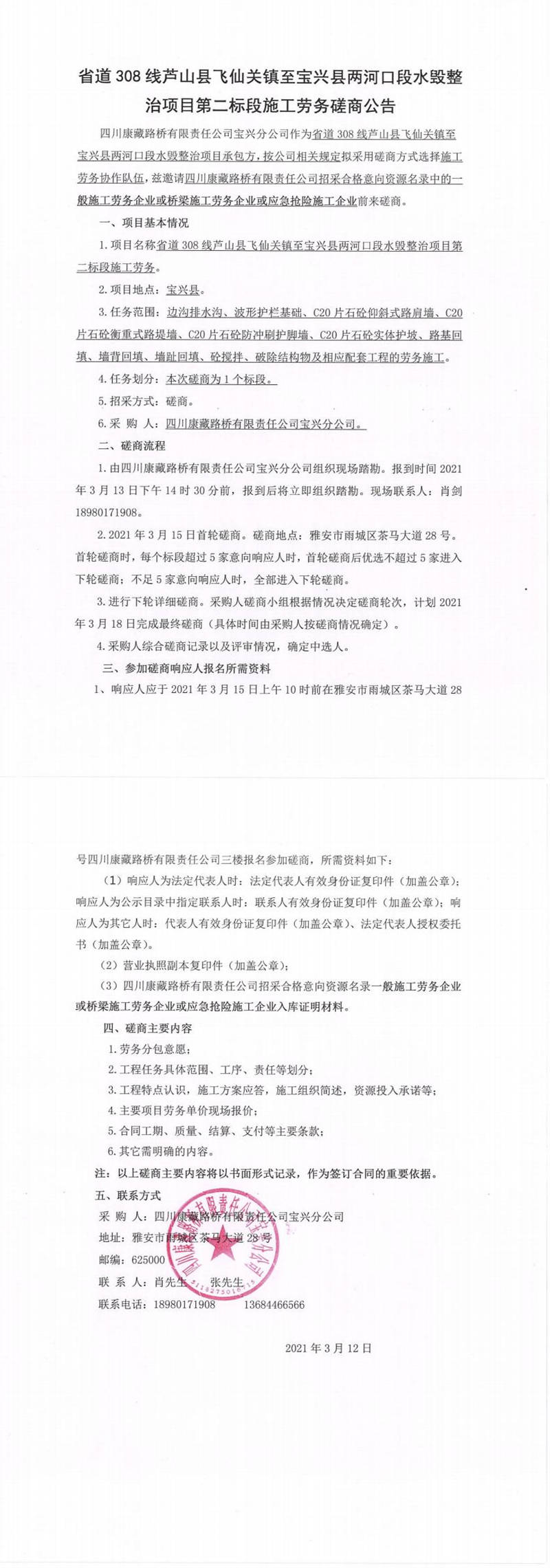 四川康藏路橋有限責(zé)任公司寶興分公司省道308線蘆山縣飛仙關(guān)鎮(zhèn)至寶興縣兩河口段水毀整治項目第二標段施工勞務(wù)磋商公告