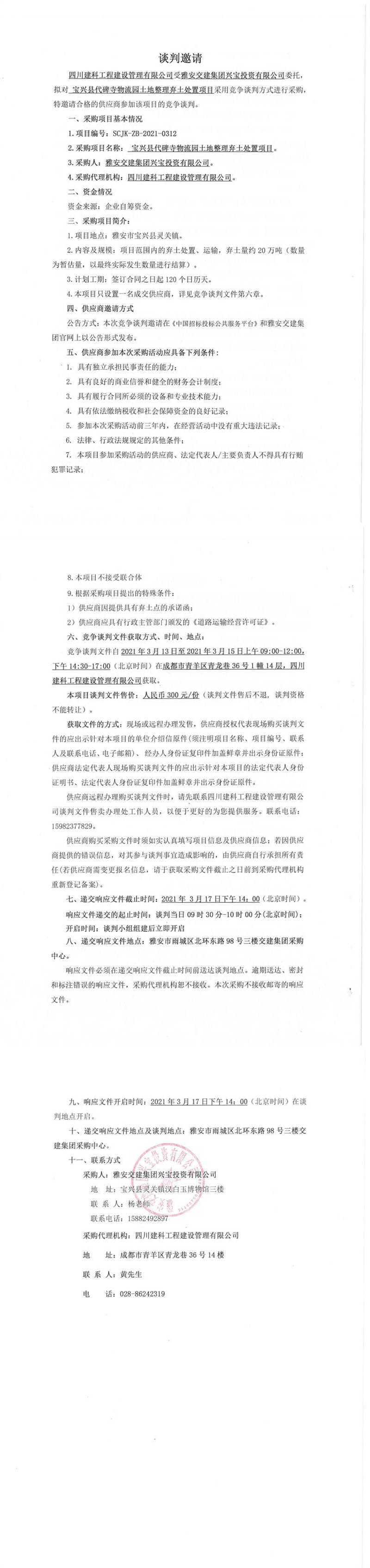 雅安交建集團(tuán)興寶投資有限公司寶興縣代碑寺物流園土地整理?xiàng)壨撂幹庙?xiàng)目競(jìng)爭(zhēng)談判公告