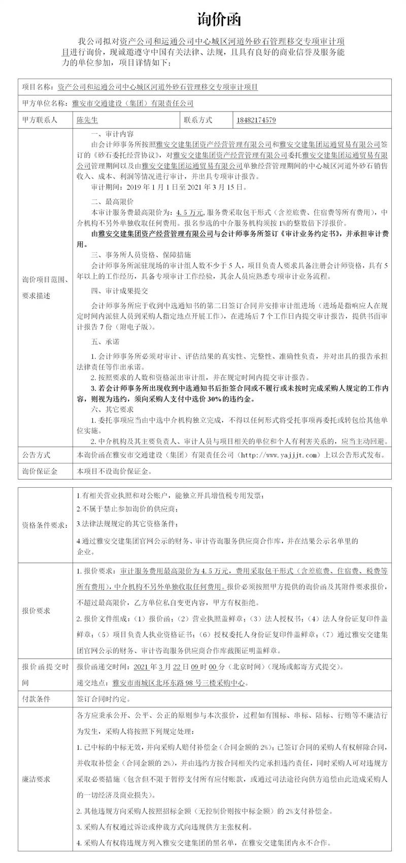 雅安市交通建設(shè)(集團)有限責任公司資產(chǎn)公司和運通公司中心城區(qū)河道外砂石管理移交專項審計項目詢價函