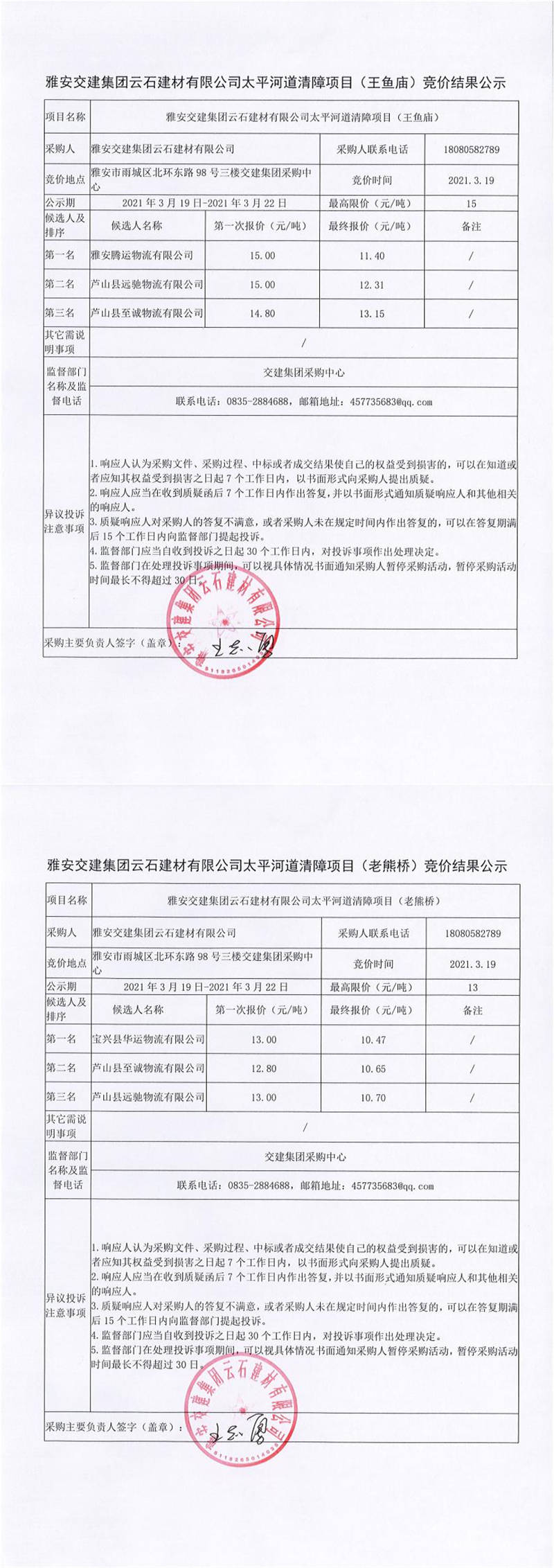 雅安交建集團(tuán)云石建材有限公司太平河道清障項(xiàng)目競價(jià)結(jié)果公示