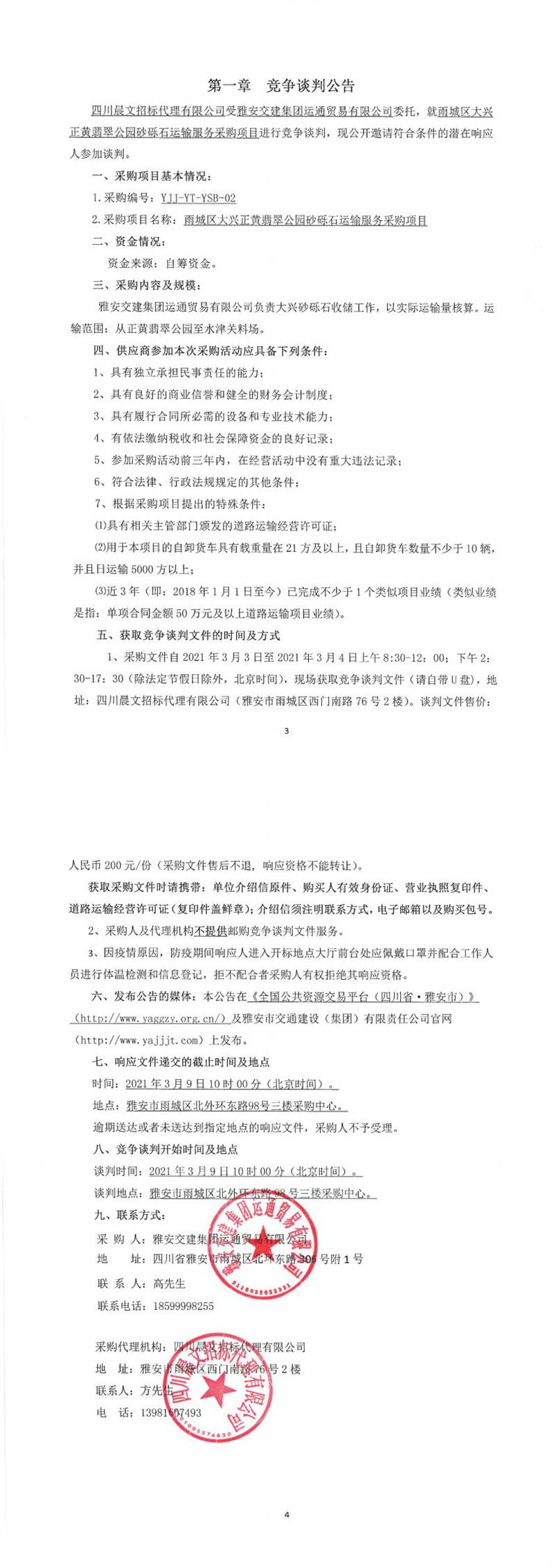 雅安交建集團運通貿易有限公司雨城區(qū)大興正黃翡翠公園砂礫石運輸服務采購項目競爭談判公告