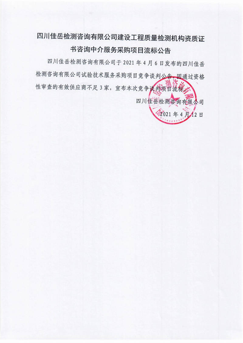 四川佳岳檢測咨詢有限公司建設(shè)工程質(zhì)量檢測機(jī)構(gòu)資質(zhì)證書咨詢中介服務(wù)采購項(xiàng)目流標(biāo)公告
