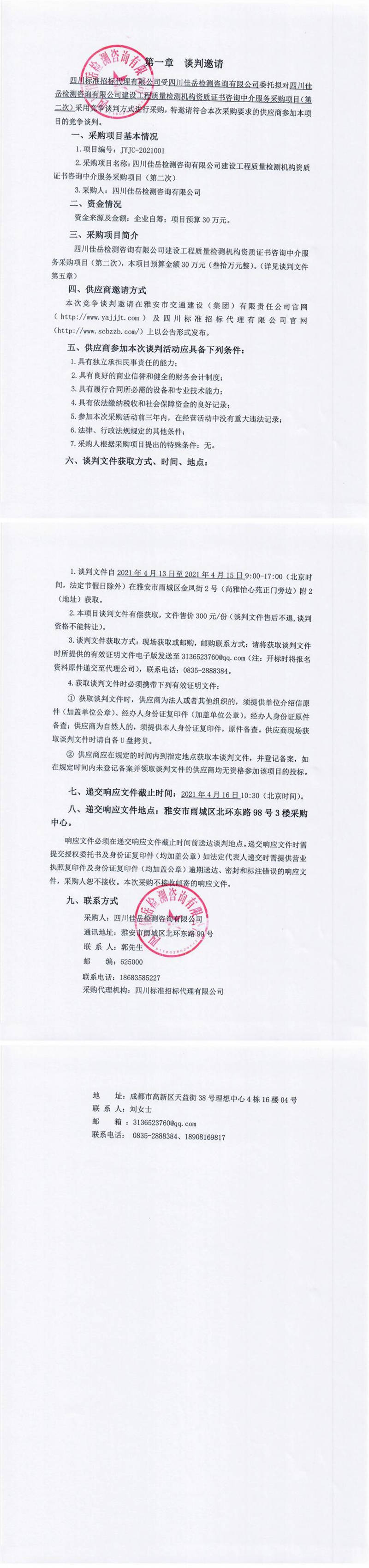 四川佳岳檢測咨詢有限公司建設工程質(zhì)量檢測機構資質(zhì)證書咨詢中介服務采購項目(第二次)競爭談判公告