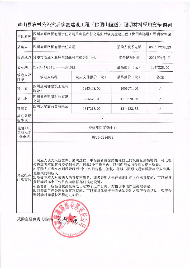四川康藏路橋有限責任公司蘆山縣農村公路災后恢復建設工程(佛圖山隧道)照明材料采購競爭談判結果公示