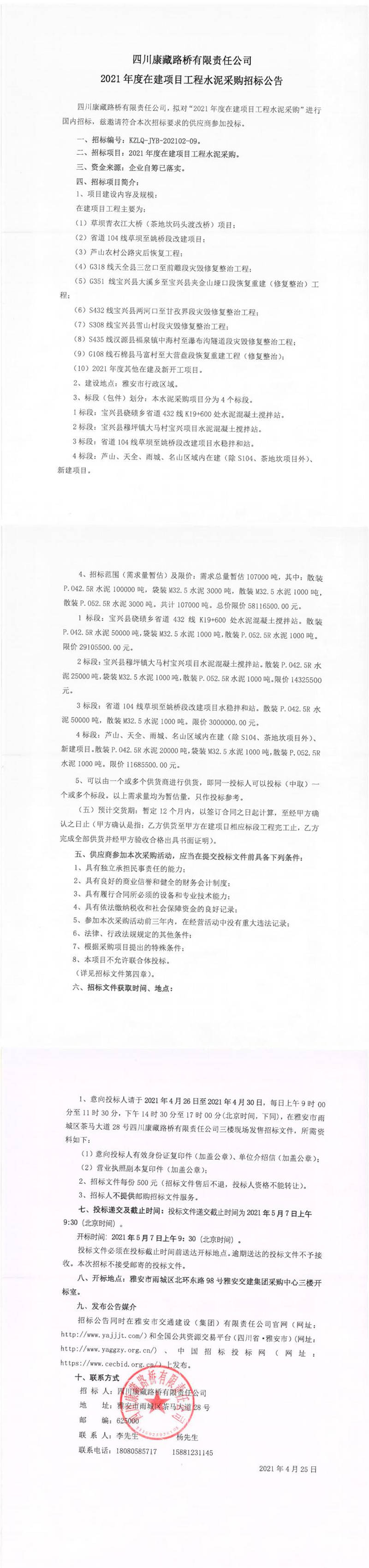 四川康藏路橋有限責(zé)任公司2021年度在建項目工程水泥采購招標公告