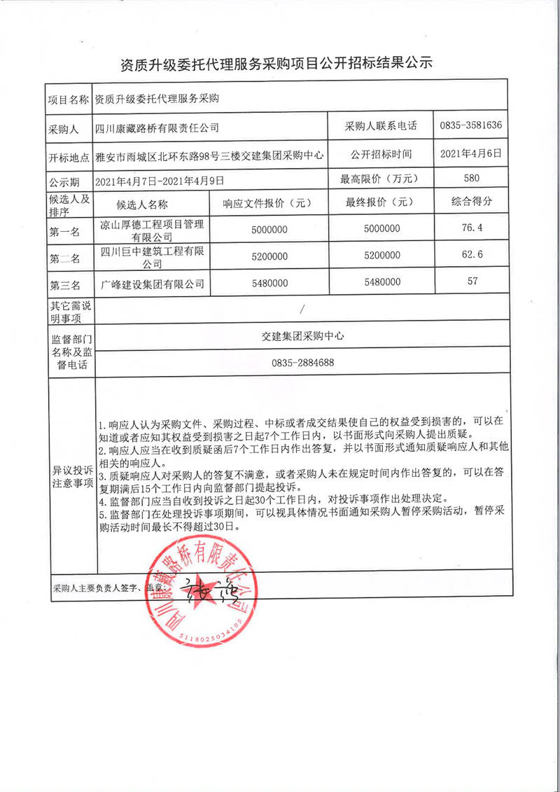 四川康藏路橋有限責(zé)任公司資質(zhì)升級委托代理服務(wù)采購項(xiàng)目公開招標(biāo)結(jié)果公示