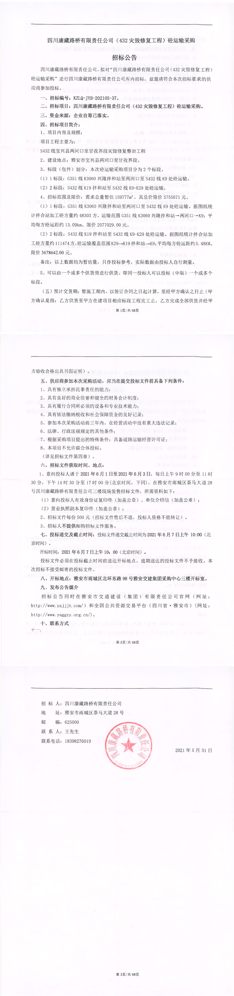 四川康藏路橋有限責任公司(432災(zāi)毀修復工程)砼運輸采購招標公告
