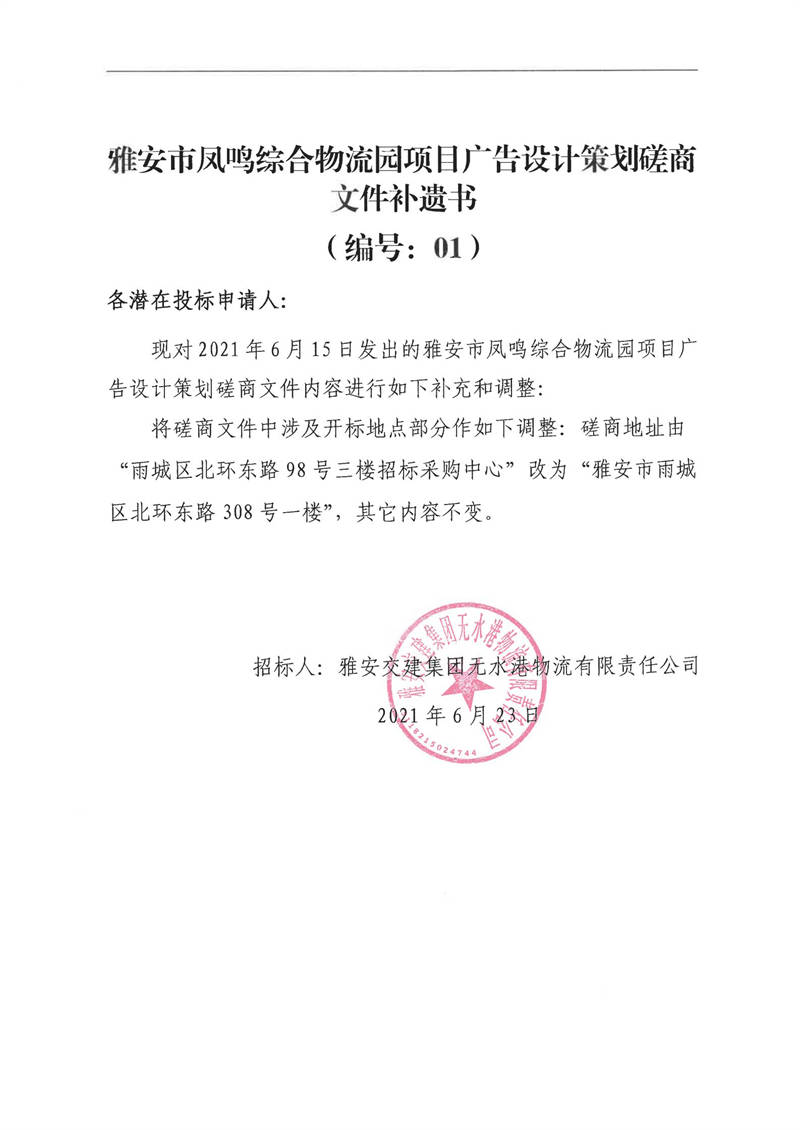 雅安交建集團無水港物流有限責(zé)任公司雅安市鳳鳴綜合物流園項目廣告設(shè)計策劃磋商文件補遺書