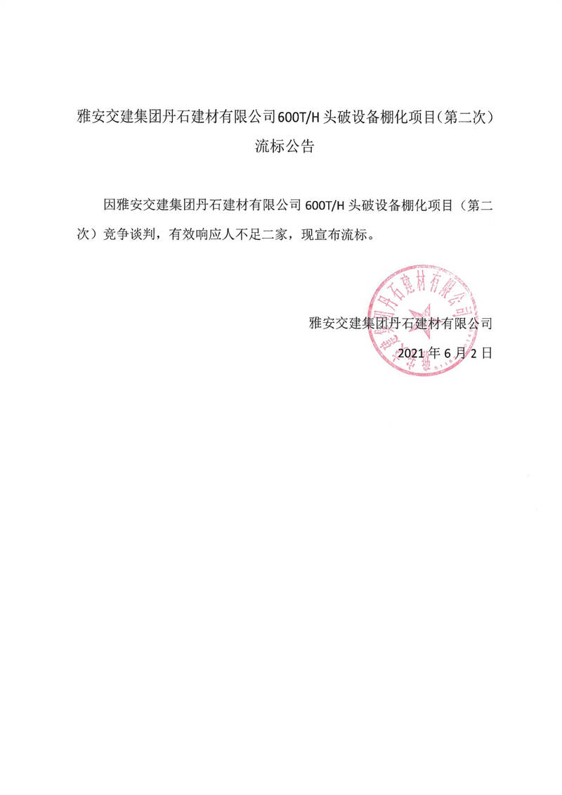 雅安交建集團丹石建材有限公司600T/H頭破設備棚化項目(第二次)流標公告