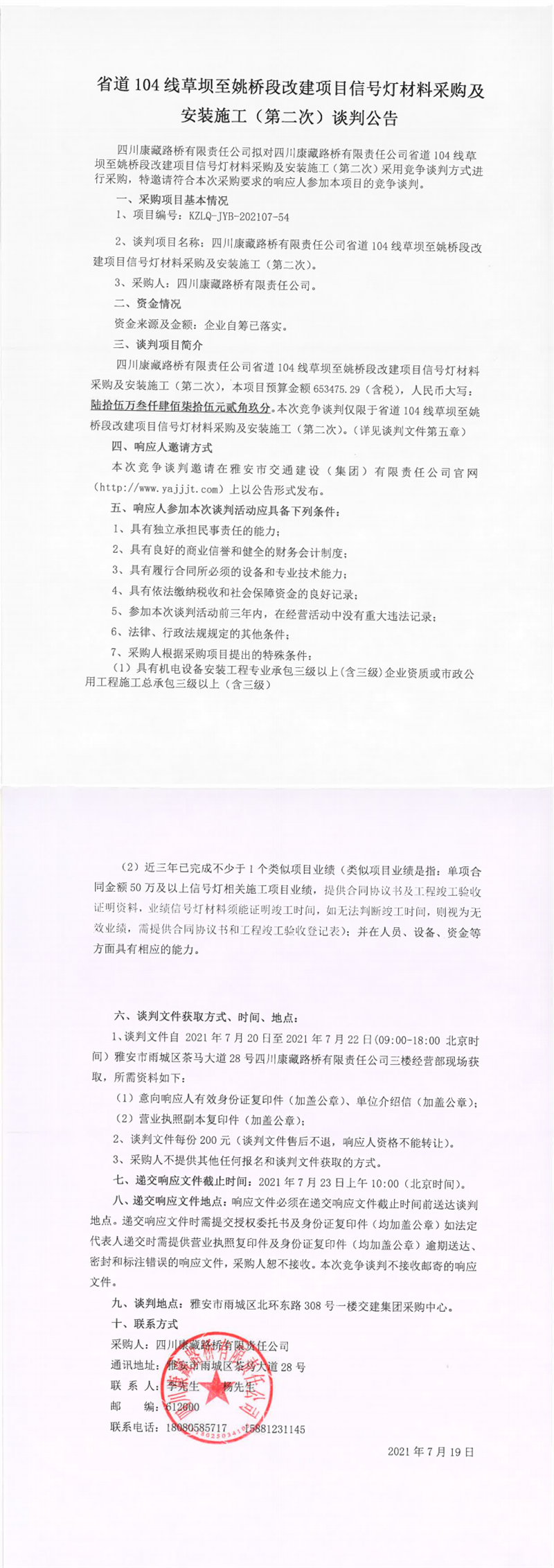 四川康藏路橋有限責(zé)任公司省道104線(xiàn)草壩至姚橋段改建項(xiàng)目信號(hào)燈材料采購(gòu)及安裝施工(第二次)談判公告