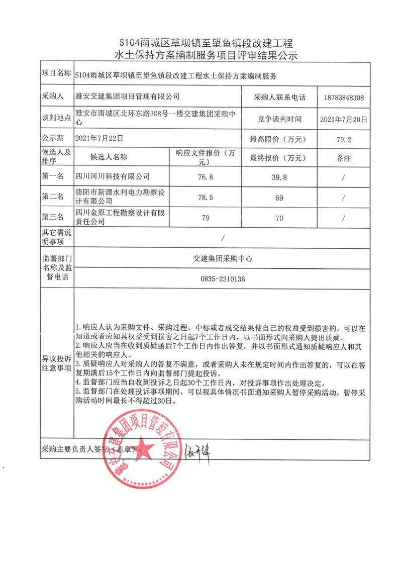 雅安交建集團項目管理有限公司S104雨城區(qū)草壩鎮(zhèn)至望魚鎮(zhèn)段改建工程水土保持方案編制服務(wù)項目評審結(jié)果公示