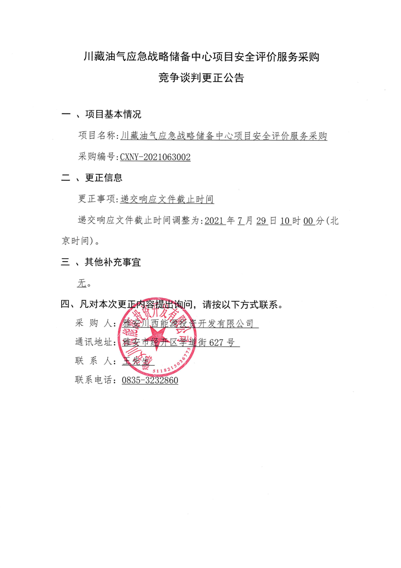 雅安川西能源投資開發(fā)有限公司川藏油氣應(yīng)急戰(zhàn)略儲(chǔ)備中心項(xiàng)目安全評(píng)價(jià)服務(wù)采購競爭談判更正公告