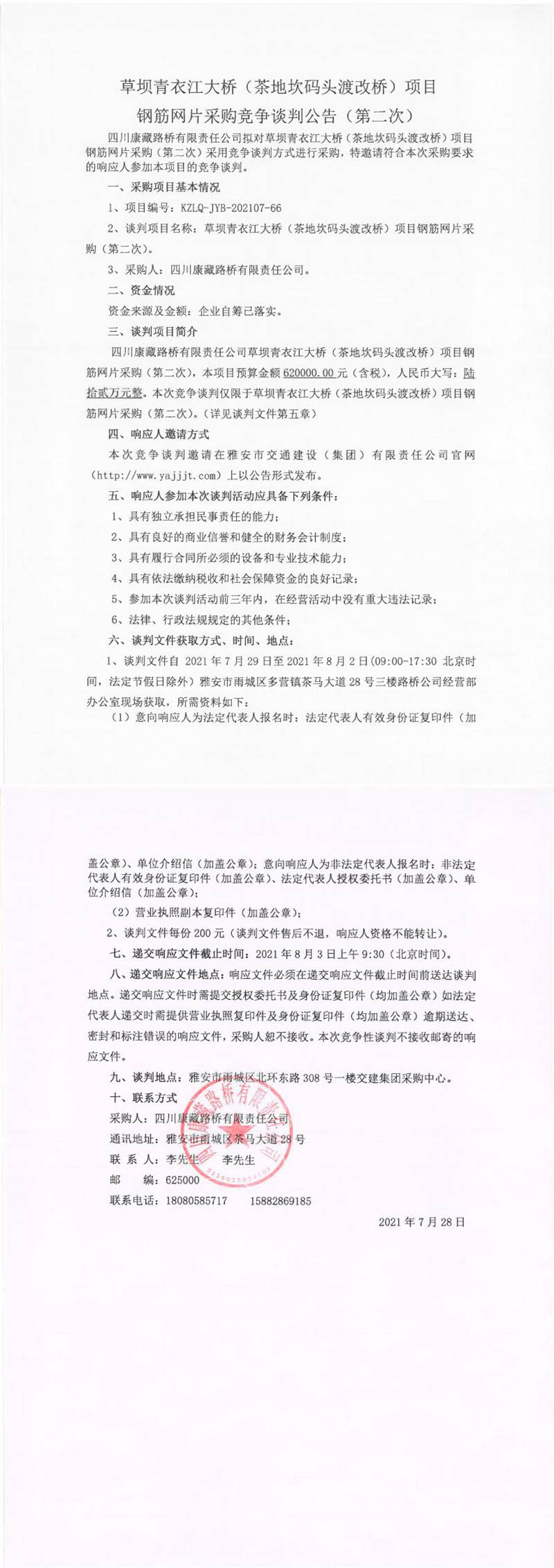 四川康藏路橋有限責任公司草壩青衣江大橋(茶地坎碼頭渡改橋)項目鋼筋網片采購競爭談判公告(第二次)