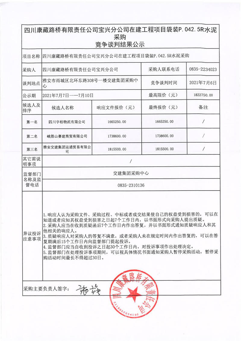 四川康藏路橋有限責(zé)任公司寶興分公司在建工程項(xiàng)目袋裝P.042.5R水泥采購競爭談判結(jié)果公示