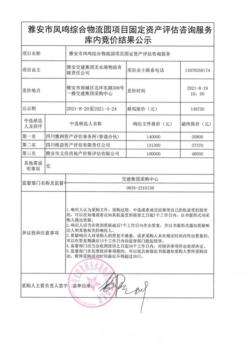 雅安交建集團無水港物流有限責任公司雅安市鳳鳴綜合物流園項目固定資產評估咨詢服務庫內競價結果公示