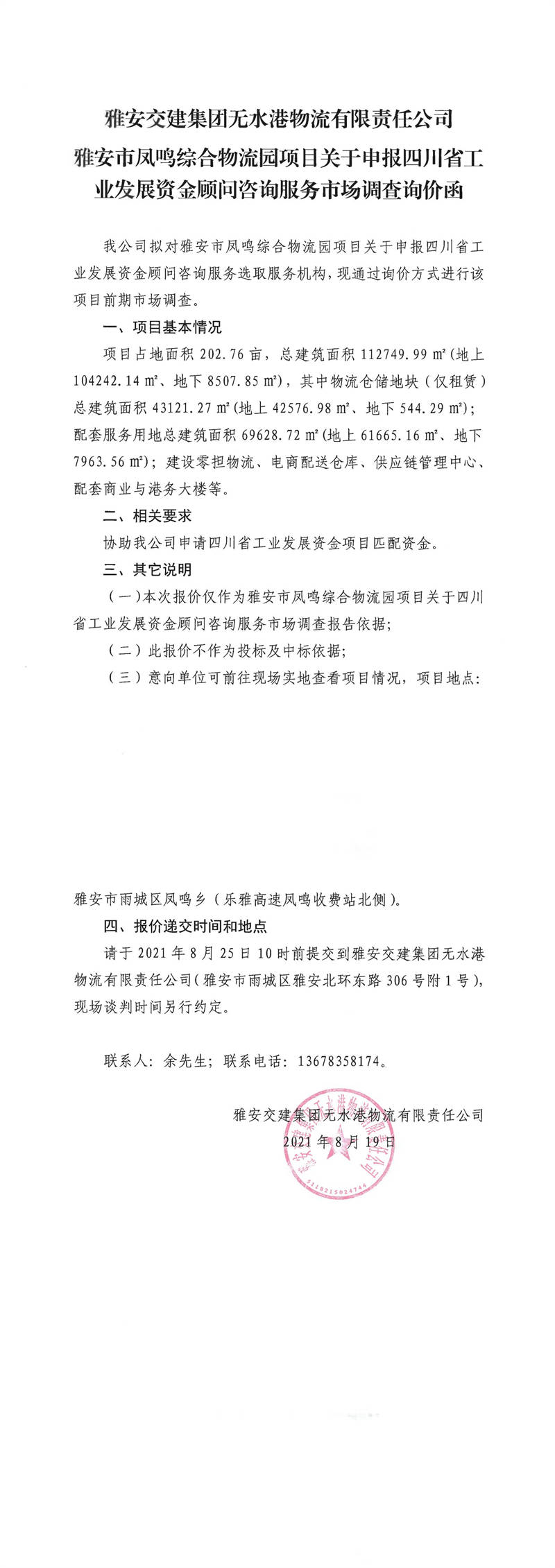 雅安交建集團(tuán)無水港物流有限責(zé)任公司雅安市鳳鳴綜合物流園項(xiàng)目關(guān)于申報(bào)四川省工業(yè)發(fā)展資金顧問咨詢服務(wù)市場調(diào)查詢價(jià)函