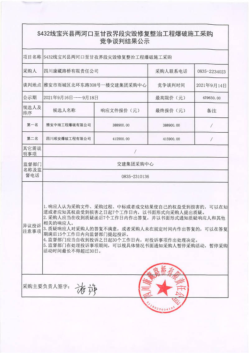 四川康藏路橋有限責(zé)任公司S432線(xiàn)寶興縣兩河口至甘孜界段災(zāi)毀修復(fù)整治工程爆破施工采購(gòu)競(jìng)爭(zhēng)談判結(jié)果公示