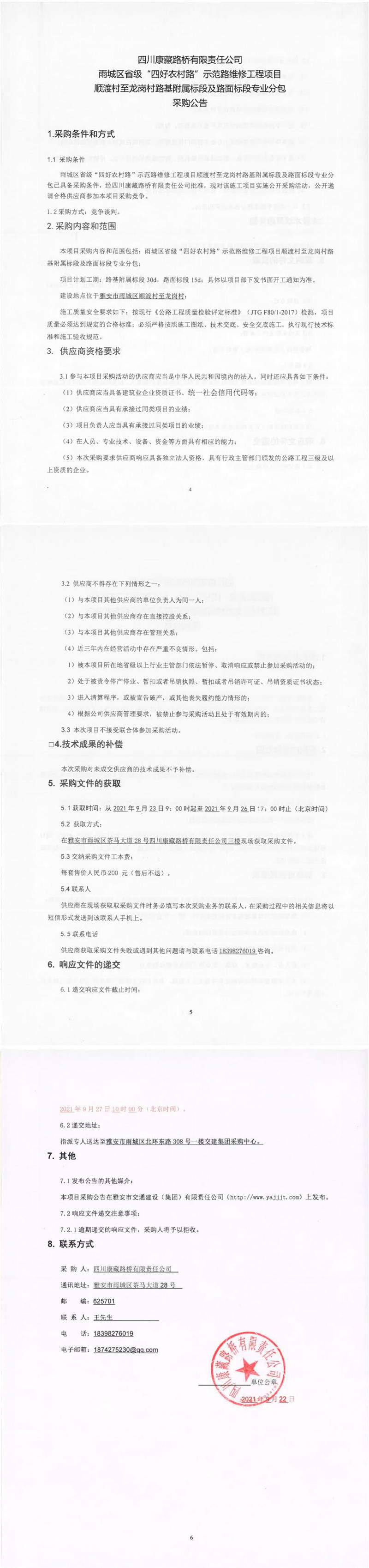 四川康藏路橋有限責(zé)任公司雨城區(qū)省級(jí)“四好農(nóng)村路”示范路維修工程項(xiàng)目順渡村至龍崗村路基附屬標(biāo)段及路面標(biāo)段專業(yè)分包采購公告