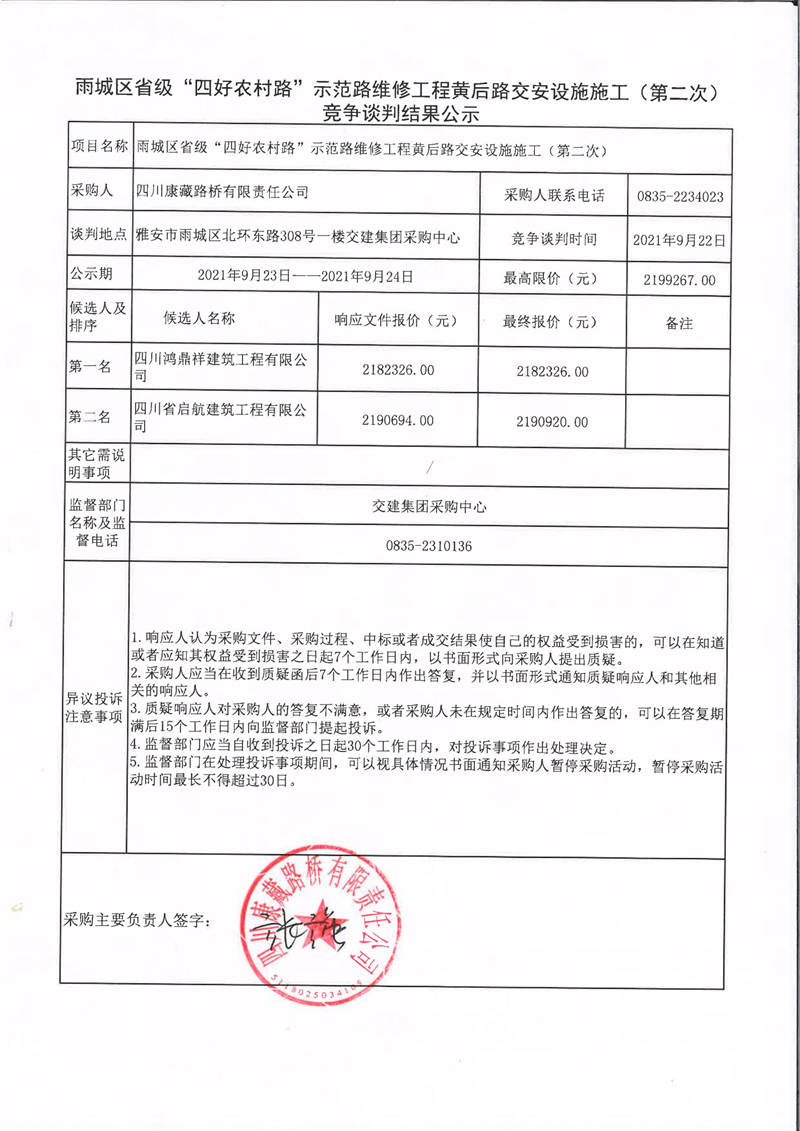 四川康藏路橋有限責(zé)任公司雨城區(qū)省級“四好農(nóng)村路”示范路維修工程黃后路交安設(shè)施施工(第二次)競爭談判結(jié)果公示