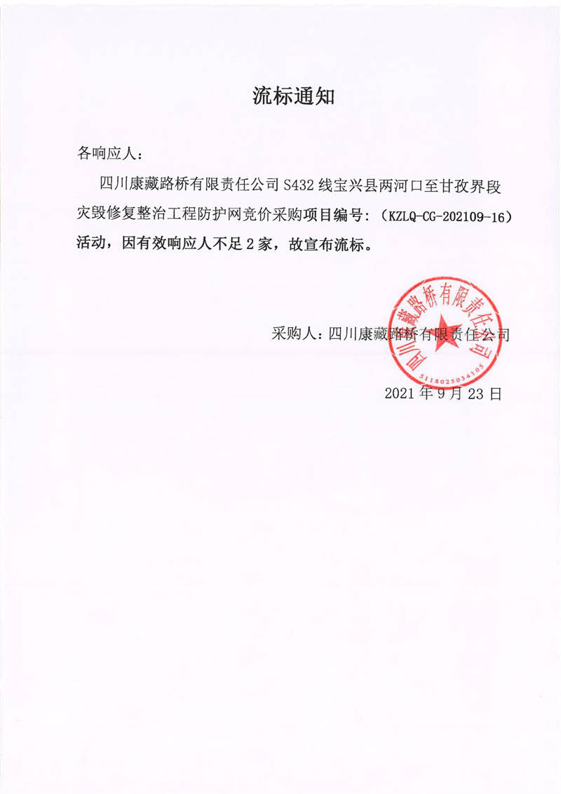 四川康藏路橋有限責(zé)任公司S432線寶興縣兩河口至甘孜界段災(zāi)毀修復(fù)整治工程防護網(wǎng)采購流標(biāo)通知