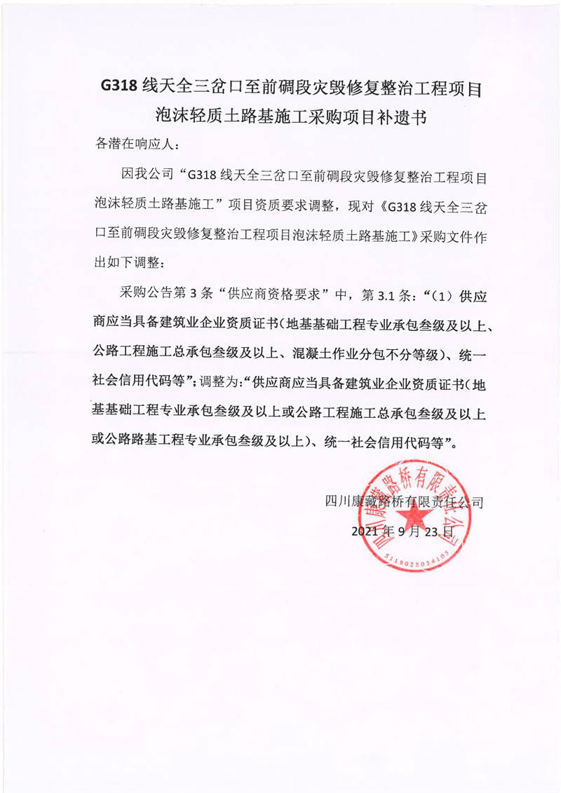 四川康藏路橋有限責任公司G318線天全三岔口至前碉段災(zāi)毀修復(fù)整治工程項目泡沫輕質(zhì)土路基施工采購項目補遺書