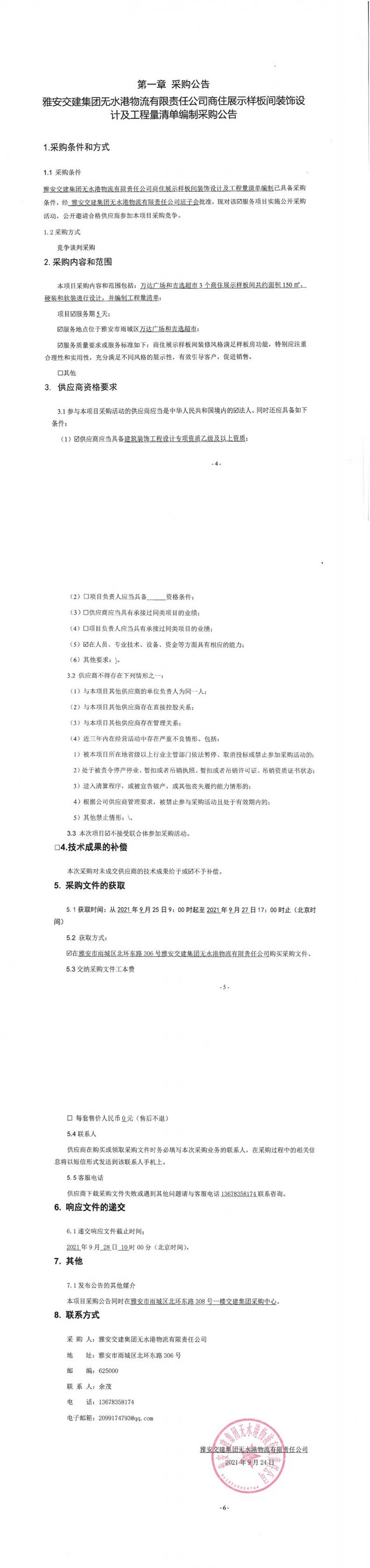 雅安交建集團(tuán)無水港物流有限責(zé)任公司商住展示樣板間裝飾設(shè)計及工程量清單編制采購公告