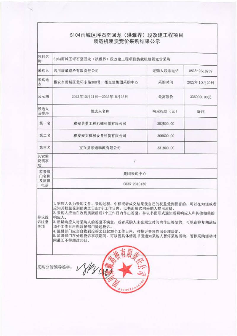 四川康藏路橋有限責(zé)任公司S104雨城區(qū)坪石至回龍(洪雅界)段改建工程項目裝載機(jī)租賃競價采購結(jié)果公示
