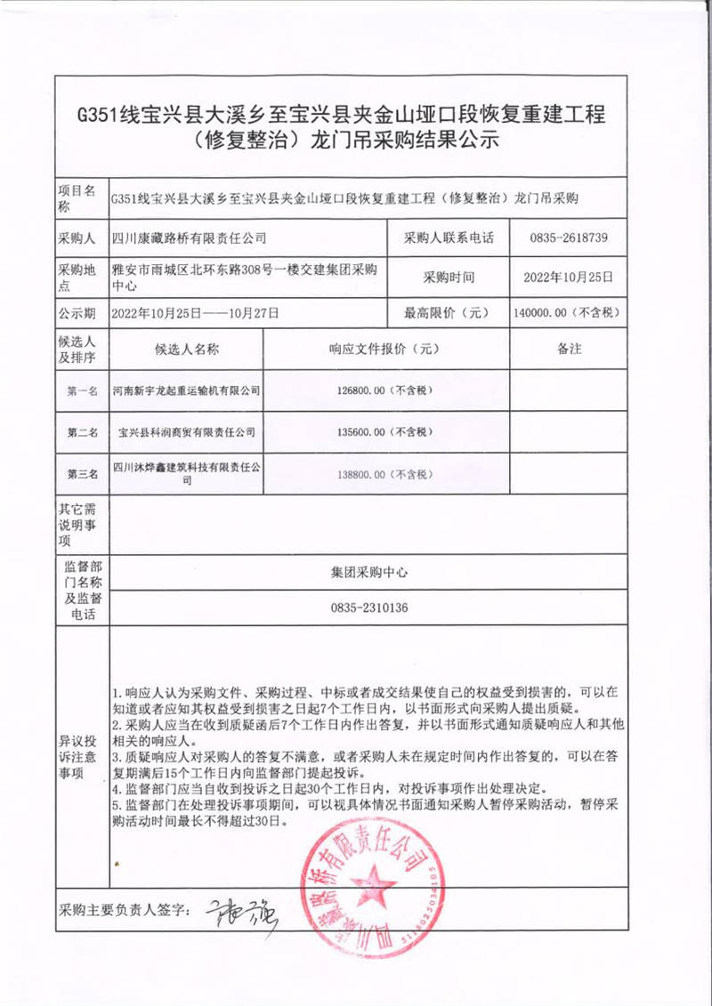 四川康藏路橋有限責(zé)任公司G351線寶興縣大溪鄉(xiāng)至寶興縣夾金山埡口段恢復(fù)重建工程(修復(fù)整治)龍門吊采購(gòu)結(jié)果公示