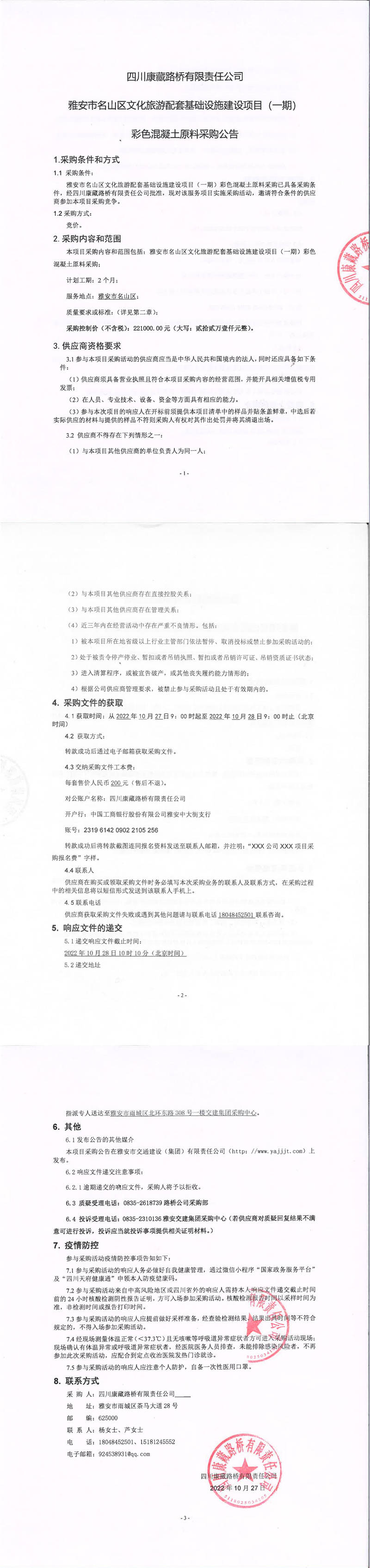 四川康藏路橋有限責任公司雅安市名山區(qū)文化旅游配套基礎(chǔ)設(shè)施建設(shè)項目(一期)彩色混凝土原料采購公告