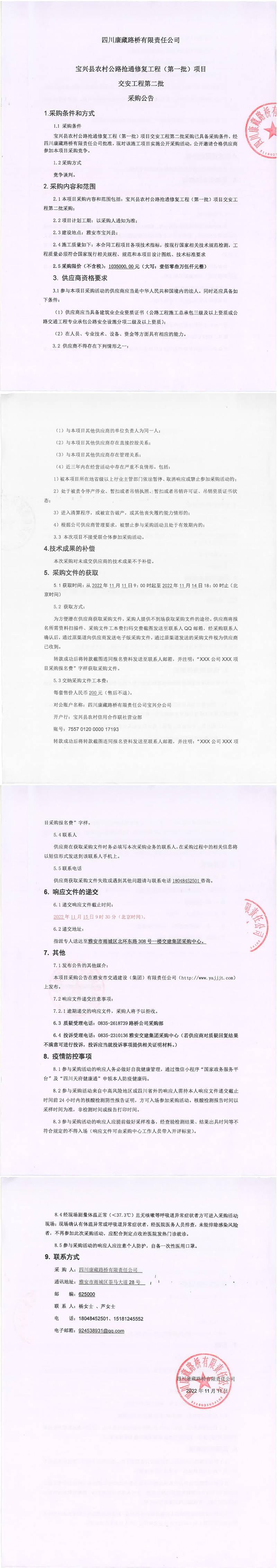 四川康藏路橋有限責(zé)任公司寶興縣農(nóng)村公路搶通修復(fù)工程(第一批)項(xiàng)目交安工程第二批采購(gòu)公告