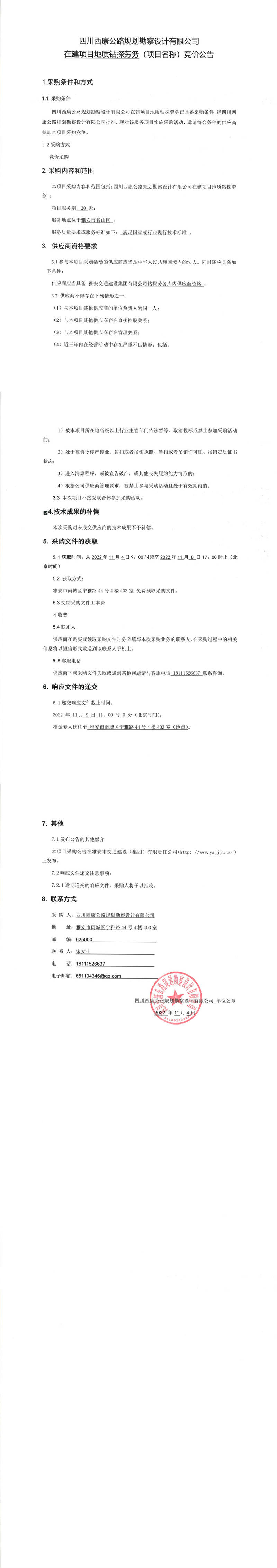 四川西康公路規(guī)劃勘察設(shè)計(jì)有限公司在建項(xiàng)目地質(zhì)鉆探勞務(wù)(項(xiàng)目名稱)競價(jià)公告