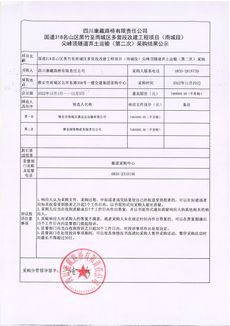 四川康藏路橋有限責任公司國道318名山區(qū)黑竹至雨城區(qū)多營段改建工程項目(雨城段)尖峰頂隧道棄土運輸(第二次)采購結果公示