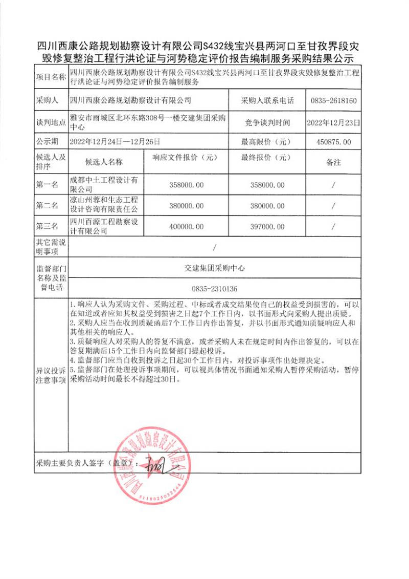 四川西康公路規(guī)劃勘察設計有限公司S432線寶興縣兩河口至甘孜界段災毀修復整治工程行洪論證與河勢穩(wěn)定評價報告編制服務采購結果公示