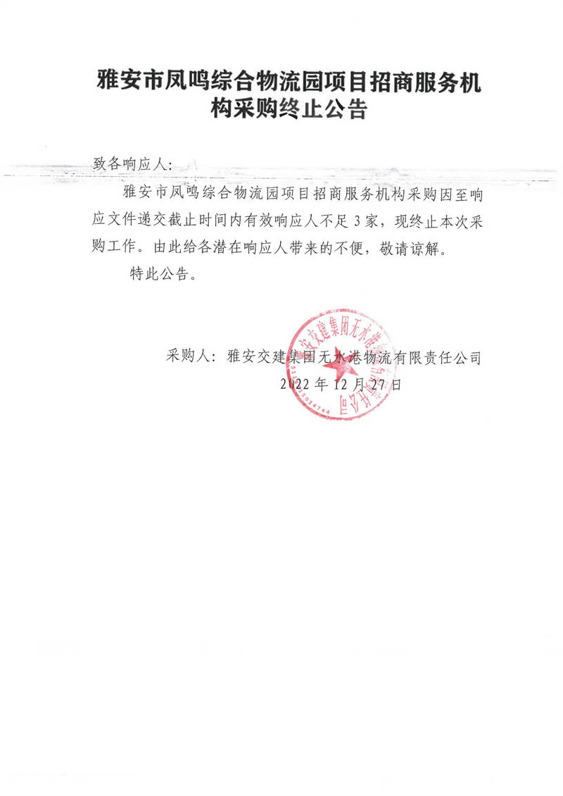雅安交建集團無水港物流有限責(zé)任公司雅安市鳳鳴綜合物流園項目招商服務(wù)機構(gòu)采購終止公告