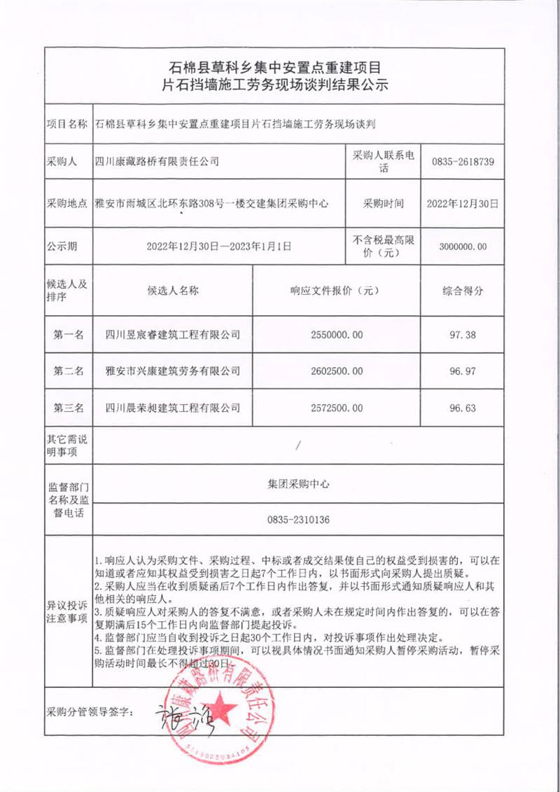 四川康藏路橋有限責(zé)任公司石棉縣草科鄉(xiāng)集中安置點(diǎn)重建項目片石擋墻施工勞務(wù)現(xiàn)場談判結(jié)果公示