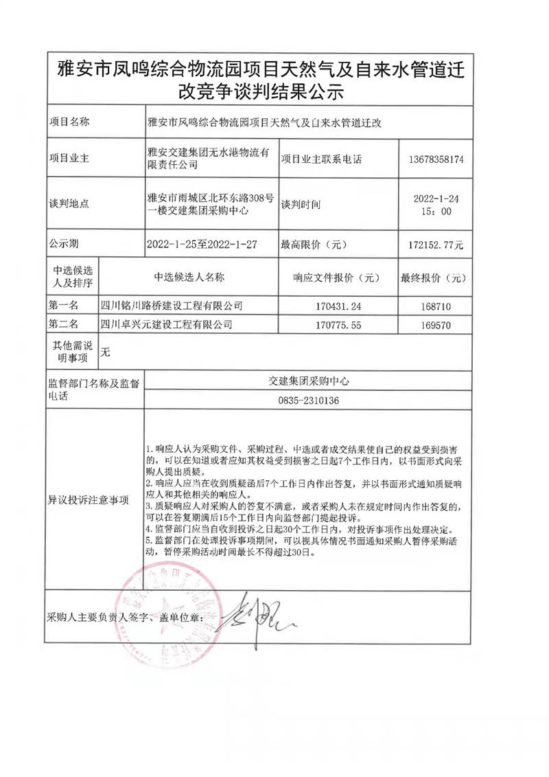 雅安交建集團(tuán)無水港物流有限責(zé)任公司雅發(fā)市鳳鳴綜合物流園項(xiàng)目天然氣及自來水管道遷改競(jìng)爭(zhēng)談判結(jié)果公示